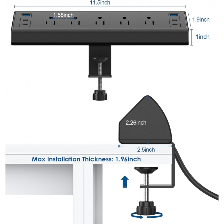 - Power Station Desk Surge Protector with Desk Clamp Edge Mount Bracket: The table needs to keep a distance of 0.4"-0.5" from the wall. The clamp fits desktops ranging from a maximum of 1.96" thick.