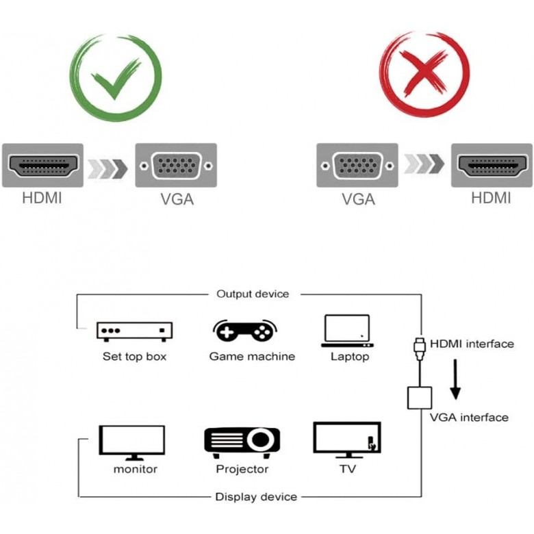- Support Video output from VGA at 1920*1080, 60Hz(Max). This is an HDMI to VGA adapter and it is not bi-directional, only transfers signal from HDMI source devices to VGA displays or monitors.