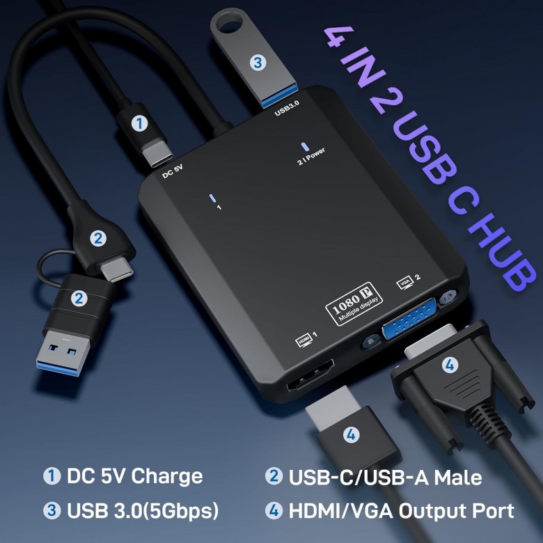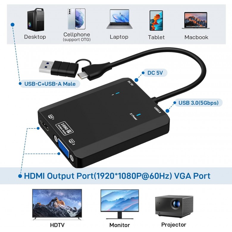 IFEART HDMI Splitter Extended Display for Dual Monitor, 1080p@60Hz USB A or USB-C to HDMI Vga Adapter for Extended Display of Laptop Monitor Desktop TV